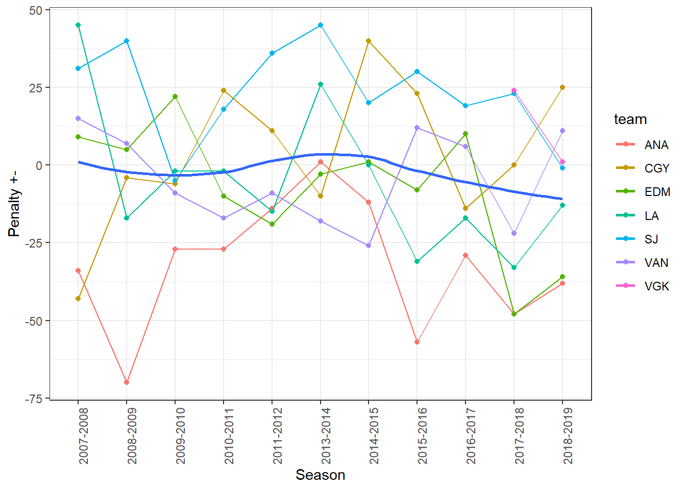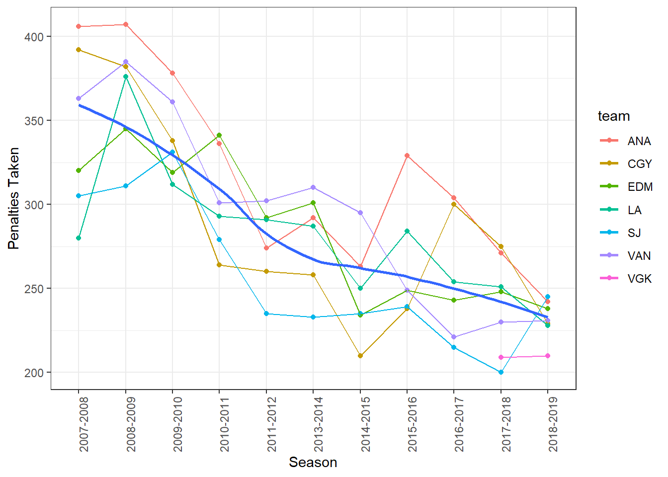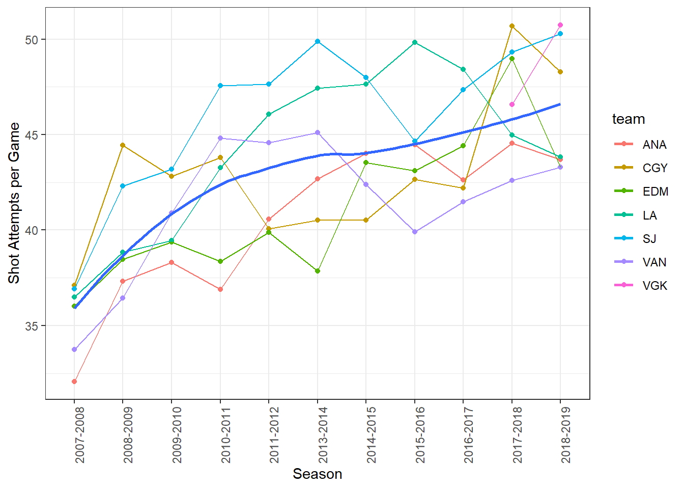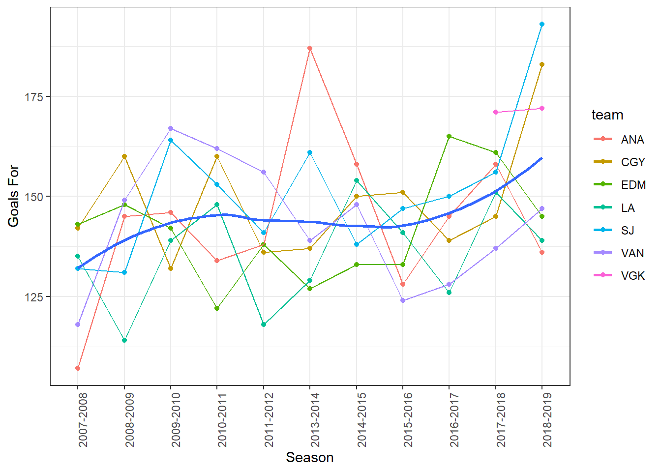 filter(team %in% c("ANA", "CGY", "EDM", "LA", "SJ", "VAN", "VGK"))Exploring some data teams